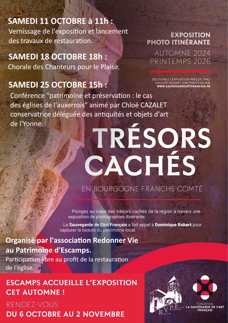 Du 6 octobre au 2 novembre 2025 : Exposition photos « Trésors Cachés de Bourgogne-Franche-Comté » de Dominique Robert à l’église d’Escamps. Organisé avec la Fondation La Sauvegarde de l’Art Français